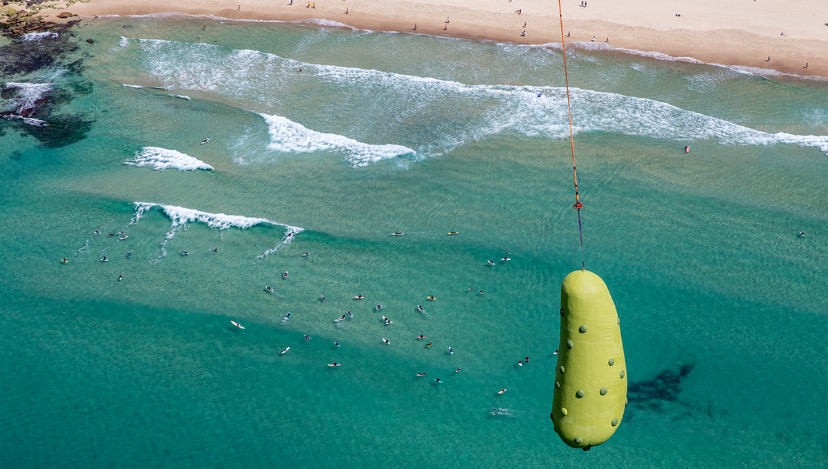 Operating within controlled airspace and strict safety protocols, the project required detailed flight planning, rigging expertise, and real-time coordination to ensure safe and accurate aerial positioning. The oversized pickle structure was securely lifted and flown along the Bondi coastline, creating a striking visual spectacle for beachgoers, local residents, and media outlets.